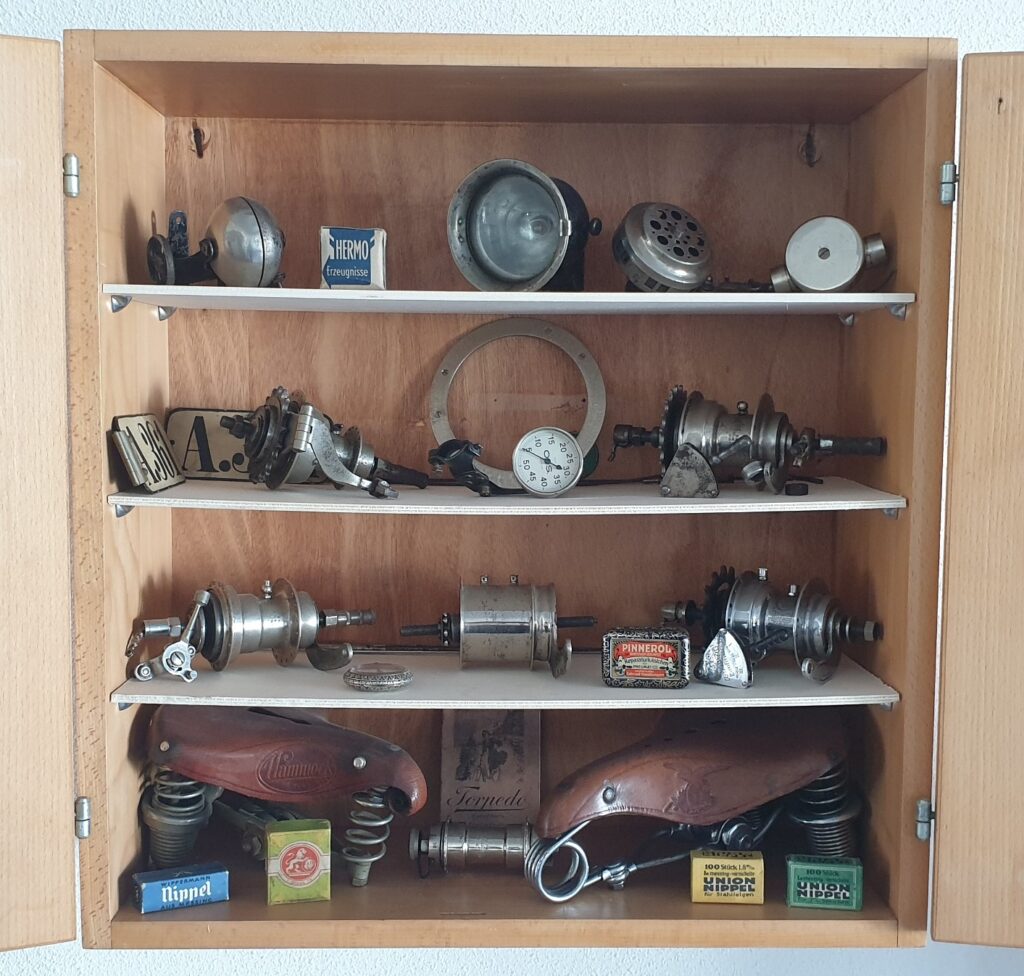 Aktuell interessiert sich Christian Horstmann besonders für Zubehör aus den 1920er und 1930er Jahren. Dabei handelt es sich um seltene Originalstücke, denn auch hier gilt: Die Objekte müssen es wert sein, in die Sammlung aufgenommen zu werden. Wenn diese „Anforderungen“ allerdings erfüllt sind, wartet ein besonderer Platz in einer von Christian Horstmanns Vitrinen, die er in seiner Wohnung aufgebaut hat. Zwar können nicht alle Fahrräder als Deko herhalten, eine Sammlung sollte aber dennoch präsentiert werden und nicht nur im Keller stehen.
